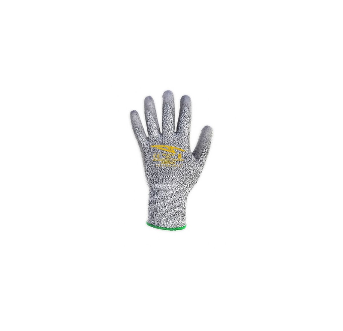 Guanto antitaglio a 5 dita con forma anatomica (destra/sinistra), supporto in filo continuo in UHMWPE e nylon col. grigio, spalmatura su palmo e dita in poliuretano colore grigio, polsino elasticizzato.