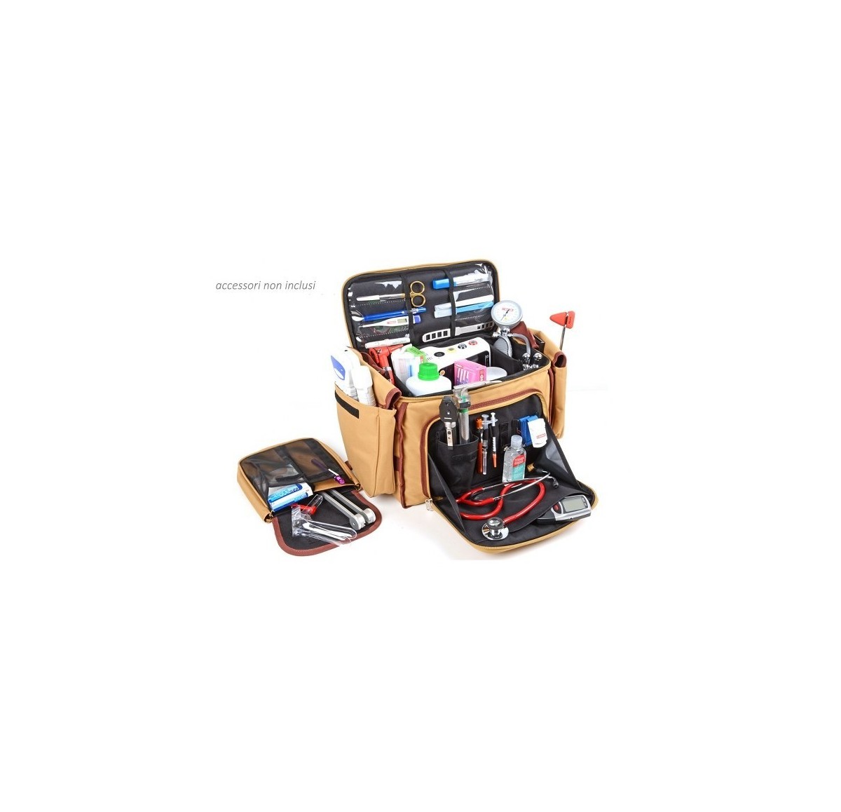 Pratica borsa per trasportare facilmente strumenti medicali e medicinali: 8 scomparti interni mobili, 3 tasche esterne, 8 elastici trattieni-strumenti, una tasca interna con cerniera, 1 borsello rimovibile (17 x 3 x h 24 cm).