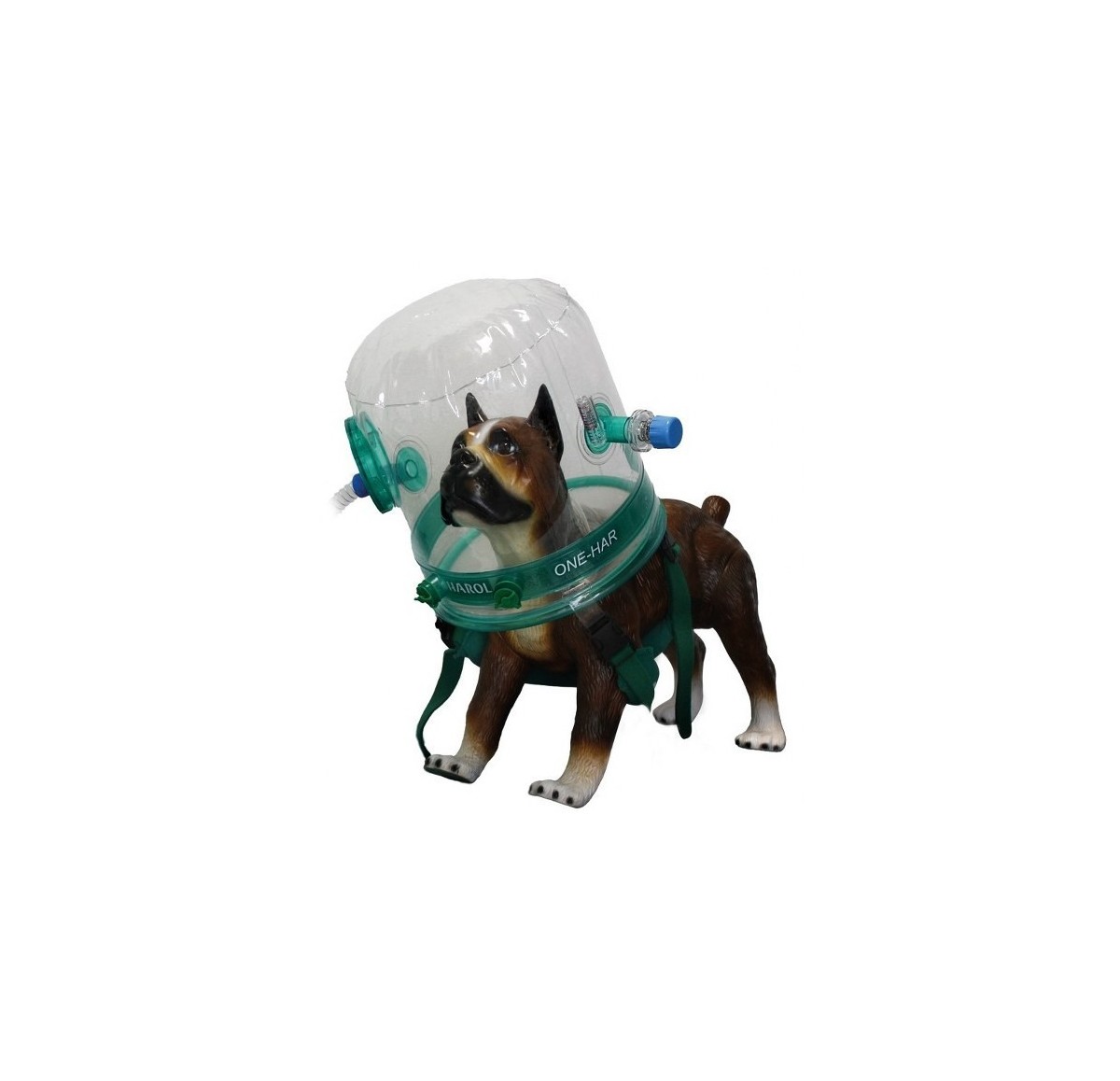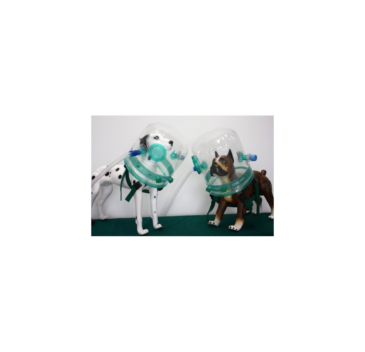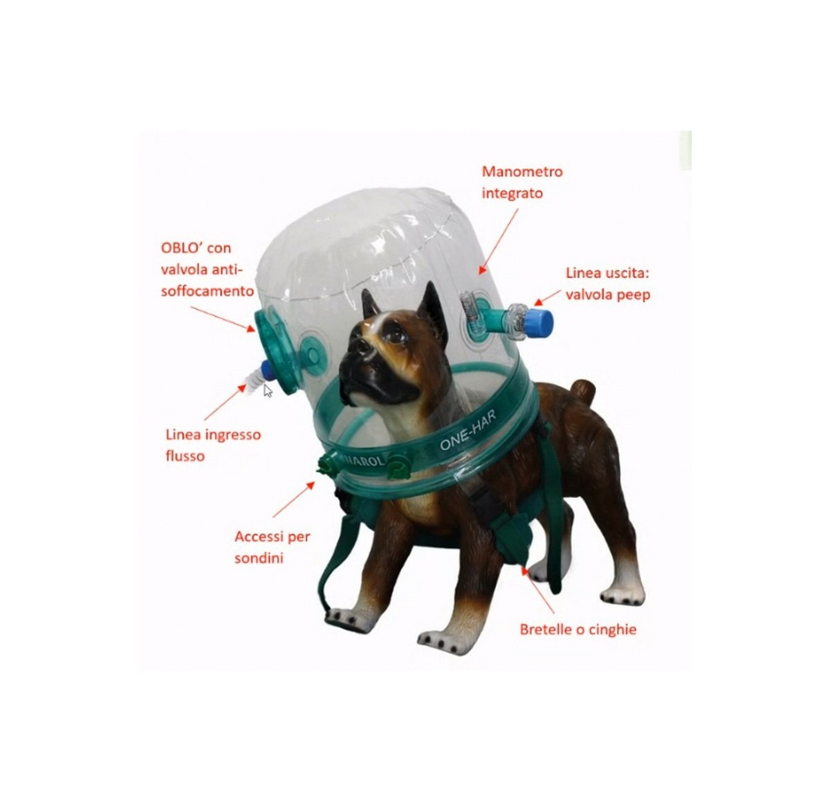 Casco CPAP specifico per pazienti veterinari con l’esclusivo collare in silicone per una tenuta ottimale sugli animali e con misure specifiche per gatti e cani di piccola taglia.