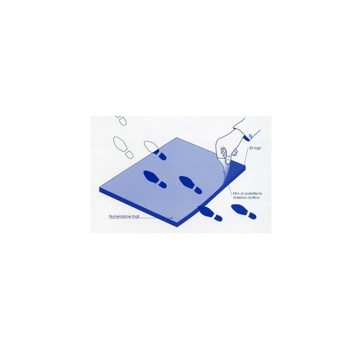 Il tappetino decontaminante è composto da uno strato di 30 fogli di film plastico di polietilene di colore blu. Un inserto colorato e numerato in ordine decrescente dal numero 30 al numero 1, permette di conoscere il numero esatto degli strati disponibili e facilita le operazioni di rimozione del foglio stesso.